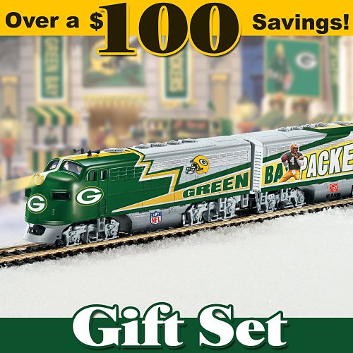 Cheese Heads unite! It's time to get on board for a football-frenzied ride you'll never forget! Presenting a collectible Green Bay Packers train set from Hawthorne Village. For the first time ever, this heirloom-quality set brings you everything you need to enjoy the classic excitement of a real working On30-scale electric train. Featuring the Diesel Locomotive, Green Bay Packers Engine and illuminated Passenger Car, this superb football collectible is a real winner. Plus, you'll also receive the FREE 16-piece track set, power pack, and the Summer Crossing Gate & Block Signal Train Accessory Set - over a 0 value.The Green Bay Packers train set will bring the excitement off the field and into your home. Officially licensed by NFL Properties LLC and PLAYERS INC., it is vividly decorated in official Packers green and gold, team symbols, plus dramatic, full-color art of your favorite players in action. Every inch of this handcrafted football collectible is precision scaled with authentic detail - from solid metal chassis and steel alloy wheels to a Passenger Car and Diesel Locomotive that actually light up. This unique NFL football collectible is perfect for you, but also makes an ultimate football fan gift. Strong demand is anticipated. Order now!