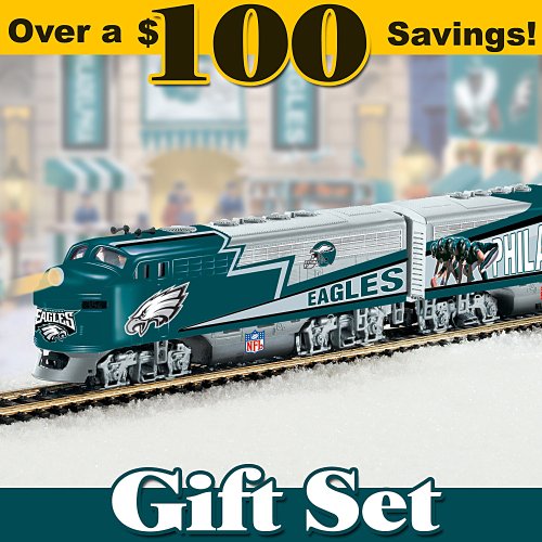 Take to the sky and soar down the tracks with football champions from the City of Brotherly Love! For the first time ever, a Philadelphia Eagles train set is headed for the end zone and ready to play. This heirloom-quality set brings you everything you need to enjoy the classic excitement of a real working On30-scale electric train. Featuring the Diesel Locomotive, Philadelphia Eagles Engine and illuminated Passenger Car, this outstanding football collectible is a big winner. Plus, you'll also receive the FREE 16-piece track set, power pack, and the Summer Crossing Gate & Block Signal Train Accessory Set - over a 0 value.This Philadelphia Eagles train set is available exclusively from Hawthorne Village and is officially licensed by NFL Properties LLC and PLAYERS INC. Boldly decorated with team colors and symbols plus dramatic, full-color art of your favorite players in action, every inch of this handcrafted football collectible is precision scaled with authentic details. Solid metal chassis and steel alloy wheels, plus a Passenger Car and Diesel Locomotive that actually light up, make this a unique NFL football collectible for you or one you'll be proud to give as the ultimate fan gift. Strong demand is anticipated. Order now!